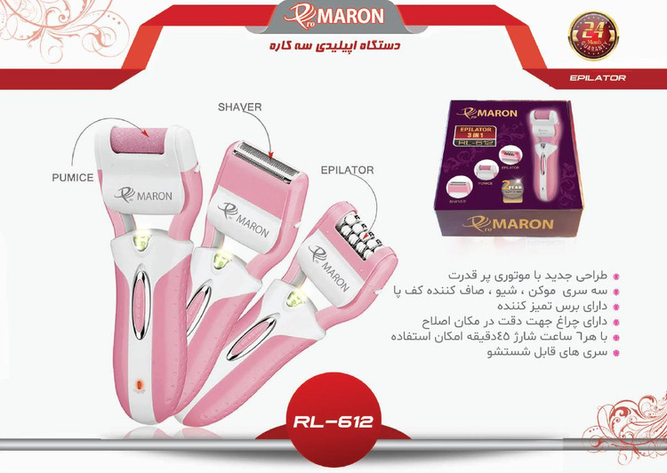دستگاه اپیلاتور سه کاره پرومارون مدل RL- 612: اپیلاتور وسیلهای بسیار کاربردی بین بانوان است زیرا توانای آن را دارد که موهای بدن را با سرعت زیاد از ریشه جدا کند و پوست لطیف و عاری از مو را به ارمغان آورد. بنابراین پیشنهاد ما دستگاه اپیلاتور RL-612 از برند پرومارون است که مورد تأیید استاندارد اروپا CE است. از مزیتهای این دستگاه برخورداری از سه سری مختلف از جنس استیل ضد زنگ است که هر کدام کاربرد خاصی دارد. که با هر 6 ساعت شارژ ا ساعت امکان استفاده را بدون نیاز یه پریز برق فراهم میکند. سری موکن قابلیت کندن موهای بسیار ریز را از ریشه دارد.