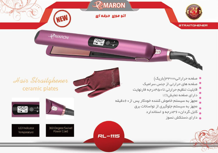 اگر دنبال اتو مویی با قدرت بالا هستید که سالهای متمادی از آن استفاده کنید پیشنهاد ما اتو موی حرفه ای پرومارون مدل RL-1115 هست که با قابلیتهای عالی که دارد قابل استفاده در سالن های آرایشی هم هست و دارای کیفیتی اروپایی با تاییدیه استاندارد اروپا CE میباشد این اتو مو دارای صفحات باریک به طول ۳۳ میلی متر هست که جنس آنها از سرامیک هست که با توزیع یکسان دما در تمامی کفی به سلامت مو آسیب نزده و موها رو نرم و ابریشمی می کند این اتو موی حرفه ای پرومارون مدل RL-1115 قابلیت تنظیم حرارت تا ۴۵۰ فارنهایت رو دارد و از طریق سیستم گرمایشی سریع PTC به سرعت داغ میشود و با استفاده از صفحه نمایش LCD از دمای مورد نظر مطلع خواهید شد و دستکش نسوزی که همراه اتو مو هست مانع سوختن دستها حین کار میشود.جهت امنیت بیشتر،سیستم خاموشی خودکار این امکان را فراهم می کند که بعد از ۶۰ دقیقه روشن ماندن ممتد خاموش شود و برا پیشگیری از خطرات احتمالی مجهز به سیستم جلوگیری از نوسانات برق است.از دیگر ویژگیهای مثبت اتو موی حرفه ای پرومارون مدل RL-1115 طراحی ارگونومیک( خوش دست)،کابل گردان با چرخش ۳۶۰ درجه،کلید قفل صفحات اشاره کرد.