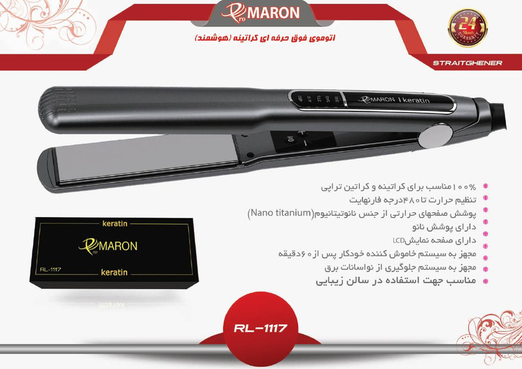 اگر کراتین کار هستین یا جزو افرادی هستین که خودتان موهایتان را در منزل کراتین میکنید در وهله اول لازم است یک اتو موی قوی مختص همین کار را داشته باشین لذا توصیه ما اتو موی فوق حرفه ای کراتینه (هوشمند)مدل RL-1117 هست که 100% مناسب کراتینه و کراتین تراپی هست که قابلیت تنظیم حرارت تا ۴۸۰ درجه فارنهایت را داراست این اتو مو که دارای کیفیتی بالا با تاییدیه استاندارد اروپا هست دارای صفحاتی استاندارد با پوشش نانو تیتانیوم هست که مواد کراتین را به بافت مو نفوذ میدهد و از آسیب دیدن موها جلوگیری میکند و موها رو صاف و شلاقی میکند این اتو مو رو می توان روی درجات مختلف دمایی تنظیم کرد که از طریق صفحه نمایش LCD تعبیه شده روی دستگاه از دمای انتخابی مطلع خواهید شد این اتو موی فوق حرفه ای کراتینه (هوشمند) مدل RL-1117 دارای پوشش نانو هست و مانع سوختن انگشتان حین کار میشود.خوشبختانه جهت امنیت بیشتر سیستم خاموشی خودکار این امکان را فراهم میکند که بعد از ۶۰ دقیقه روشن ماندن ممتد خاموش شود و برا پیشگیری از خطرات احتمالی اتو موی فوق حرفهای کراتینه پرومارون مدل RL-1117مجهز به سیستم جلوگیری از نوسانات برق است.