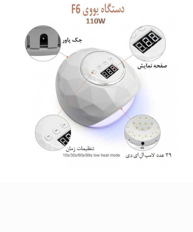 دستگاه یو وی ال ای دی سان مدل F6 تولید شده در کارخانه سان کشور چین دستگاهی با قدرتی بالا معادل 86 وات است که توسط 39 لامپ ترکیبی یو وی - ال ای دی تامین می شود. این دستگاه برای استفاده حرفه ای در سالن های زیبایی و استفاده در منزل مناسب است.